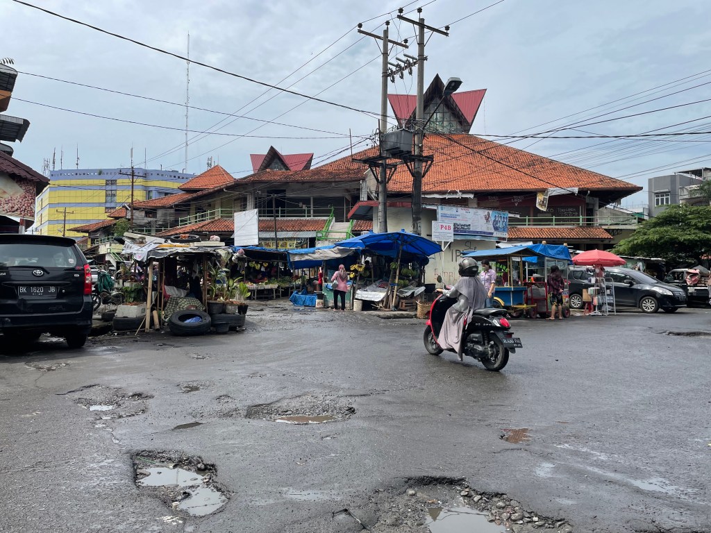 The traditional market centers around a building specifically designed for the market. The two-story building provides shade for a host of vendors selling everything from sandals to freshly slaughtered chickens, fish, and pork. Around this main building sprout up additional merchants under tarps selling their wares out in the sun. The streets are paved but full of potholes, and there is a continual flow of mopeds and cars as well as becaks, traditional motorcycle carriages and even a few pedi-cabs, also designed to carry passengers or cargo but with leg power instead of horsepower.