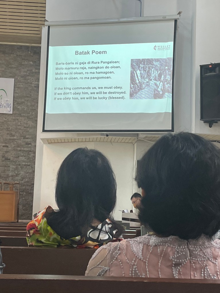 As part of his sermon he included a traditional Batak poem. The Batak are one of the major people groups (tribes) in North Sumatra, and there are many Batak people in Medan. Their traditional homelands are to the west and south of us and their influence is strong even in Medan where there are also many people from other tribes. The Batak people also have a separate language that is not Bahasa Indonesia (which is based off the Melayu language/people group). I can say hello and goodbye in Batak but that’s about it! One language is plenty for me to focus on right now, thank you!