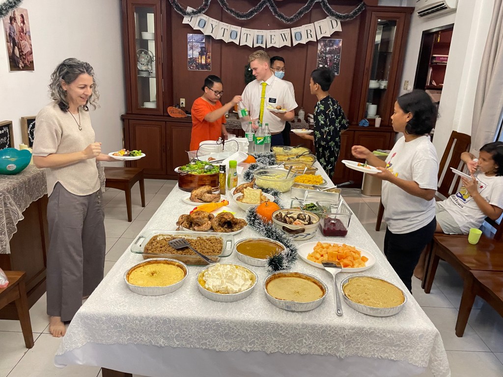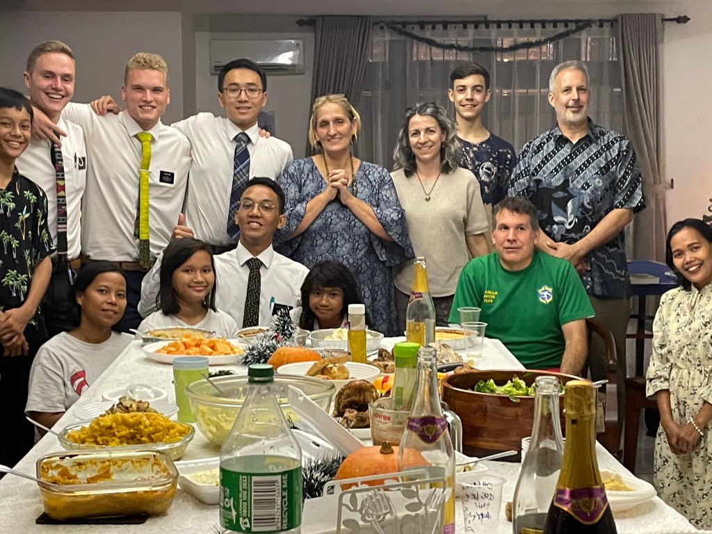 Our first was last night. Gena found someone through Facebook searching for other American ex-pats in Medan who might want to gather for Thanksgiving. What it ended up being was a fairly American Thanksgiving (sans Turkey) with about a dozen Mormons and sundry offspring. Roast chicken subbed in for roast Turkey, and we made traditional bread stuffing, and there was mashed potatoes and yams and a variety of desserts as well.