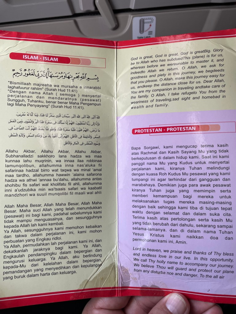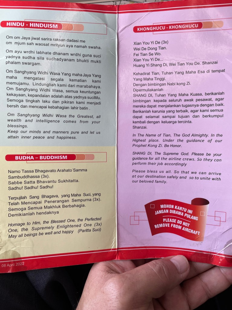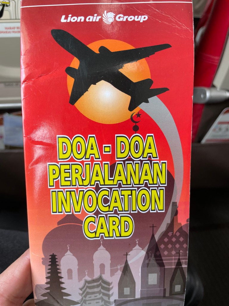 The above photo is an item found in the seatback pocket on my flight today to Singapore. Lion air Group is a discount airline company. While the title is translated as Invocation Card I like the translation Travel Prayers. So the airline is providing this to customers on it’s flights who may feel a desire to pray before, during or after their travels and would like some guidance on what to say.