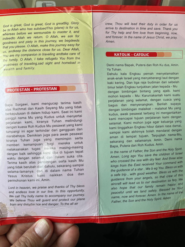It’s interesting to note the differences between the prayers, not only in who they are directed to but what they ask for. Can you imagine if airlines in the US put something like this in their seatback pockets? I wonder how long it would take for the lawsuits to start flying or the public pressure began to remove them?!