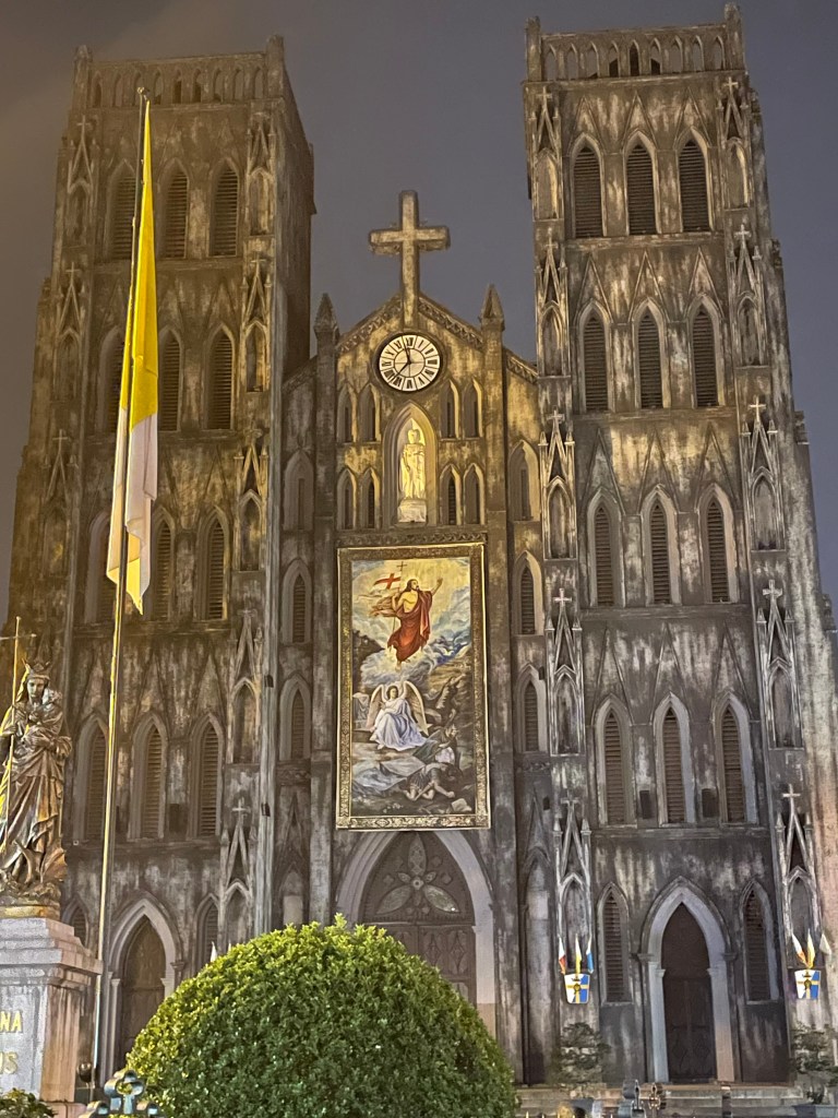 However, I did get this photo of St. Joseph Cathedral in the Old Quarter of Hanoi late one night. Earlier in the evening the courtyard and steps in front of the entrance was jammed as people gathered to listen to an evening service despite a light, misting rain. The banner hanging in front is for Easter, showing our victorious Lord over the terrified Roman guards as well as the empty tomb. What a joy it is each day but particularly during this time of year to remember the victory our Lord won not just for himself but all creation!