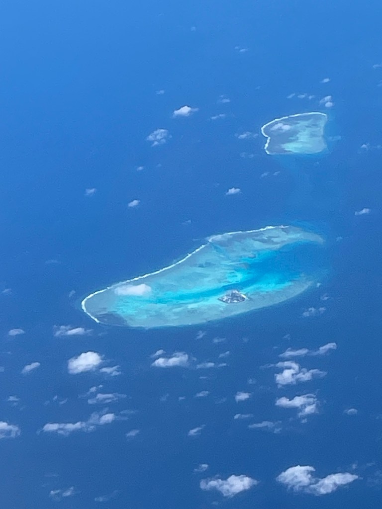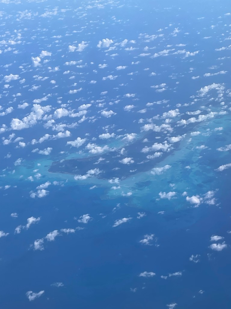 Flying over the ocean is something I haven’t done as much of, but in the last year I’ve done a lot of it already. I’m blessed to see amazing sites through the sky pockmarked with clouds like errant popcorn tossed lazily mid-air from some cosmic bowl to some divine mouth. The clouds themselves are so fascinating I forget that sometimes there are things to be seen below them, such as what (if my Googling is correct) might be Pearson Reef, below.