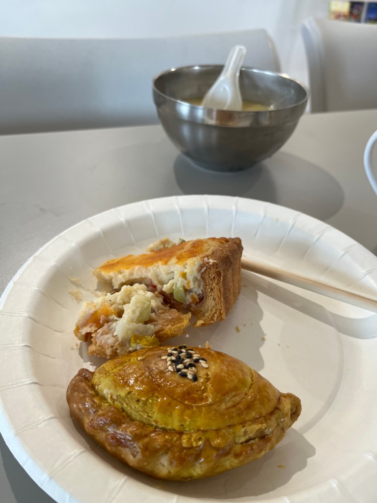 The bowl contains a corn soup that is very popular in Taiwan. Slightly savory and very, well, corny! There was a baked pie that was similar to a quiche with vegetables and meat in a flaky crust. And the pastry in the forefront had a savory curried meat filling. There was a glutenous rice dessert. So maybe the food options are slightly different from gatherings in the US, but the same basic idea.