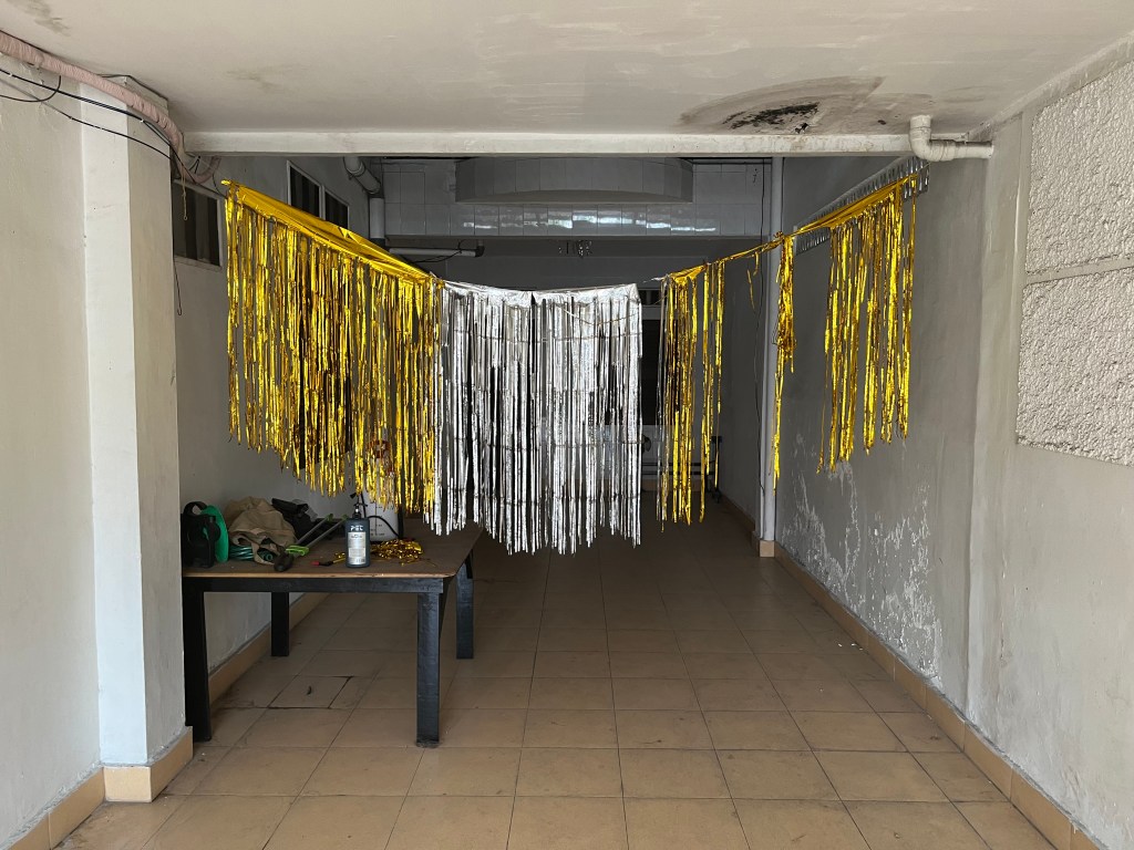 This might look like the sad remnants of a birthday celebration. But it’s not. Gena devised this for a very different reason. It spans the inner area of our carport. We don’t have a car, but we have a large area where we could park two cars end to end if we were so inclined. There are bright fluorescent light bulbs both in the more interior area of the carport (barely visible in the photo above) and in the area closer to the street.