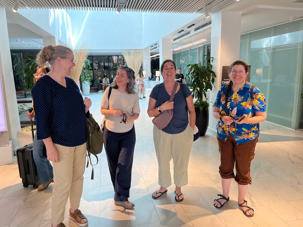 Above: Melinda Thews, Gena, Aimee Cima and Martha Mahlburg prepare to head their separate ways back to Taiwan, Indonesia, Cambodia and Sri Lanka, respectively. Hannah Hester from Taiwan is trying to hide behind Mindy!