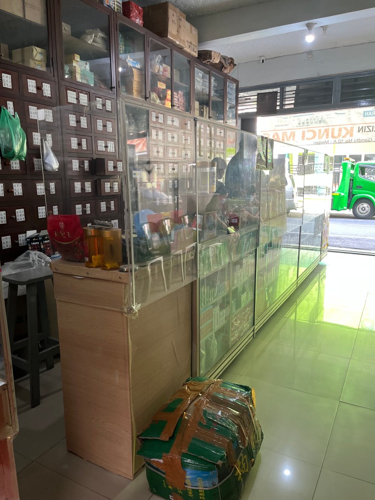 Since it isn’t a serious medical emergency, she opted to start dealing with it recently by trying something she’s always been fascinated by but had limited opportunity to seek out – Chinese herbal medicine. The opportunity to at least experiment with this alternative before seeking a more Western remedy was too good to pass up here in Medan. But how to find a Chinese doctor?